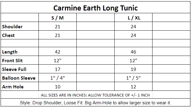Feel confident and elegant in our Carmine long earth Tunic. Made from high quality materials, this tunic features a stunning carmine color that will make you stand out from the crowd. Its long length provides comfortable coverage, making it perfect for any occasion. Elevate your wardrobe and make a statement with our Carmine long earth Tunic!