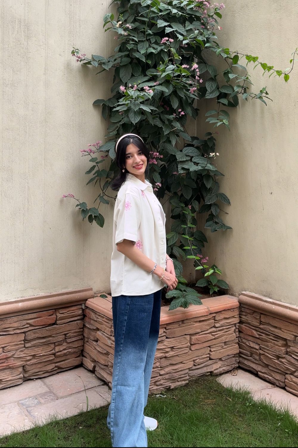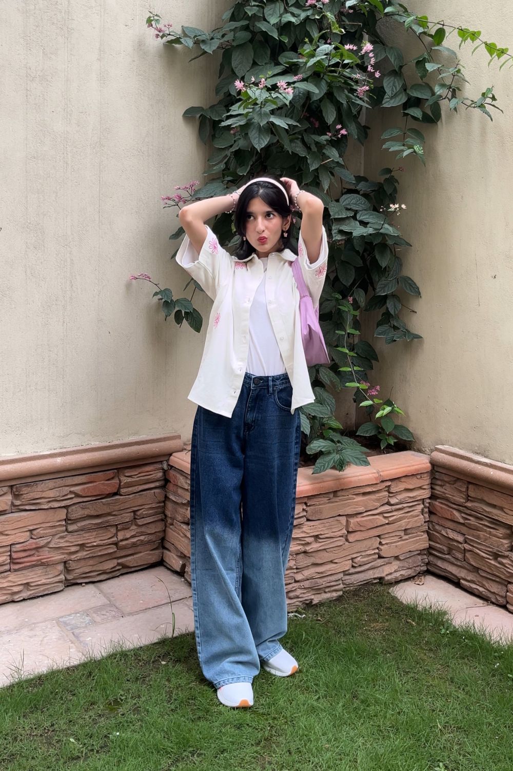 Elevate your casual wardrobe with this stylish Pink Boxy Shirt paired with Ombre Skater Jeans. The white shirt features delicate pink floral embroidery, adding a feminine touch to your look. Complementing it perfectly, the blue skater jeans showcase a washed-down shading effect for a trendy, effortless vibe.
